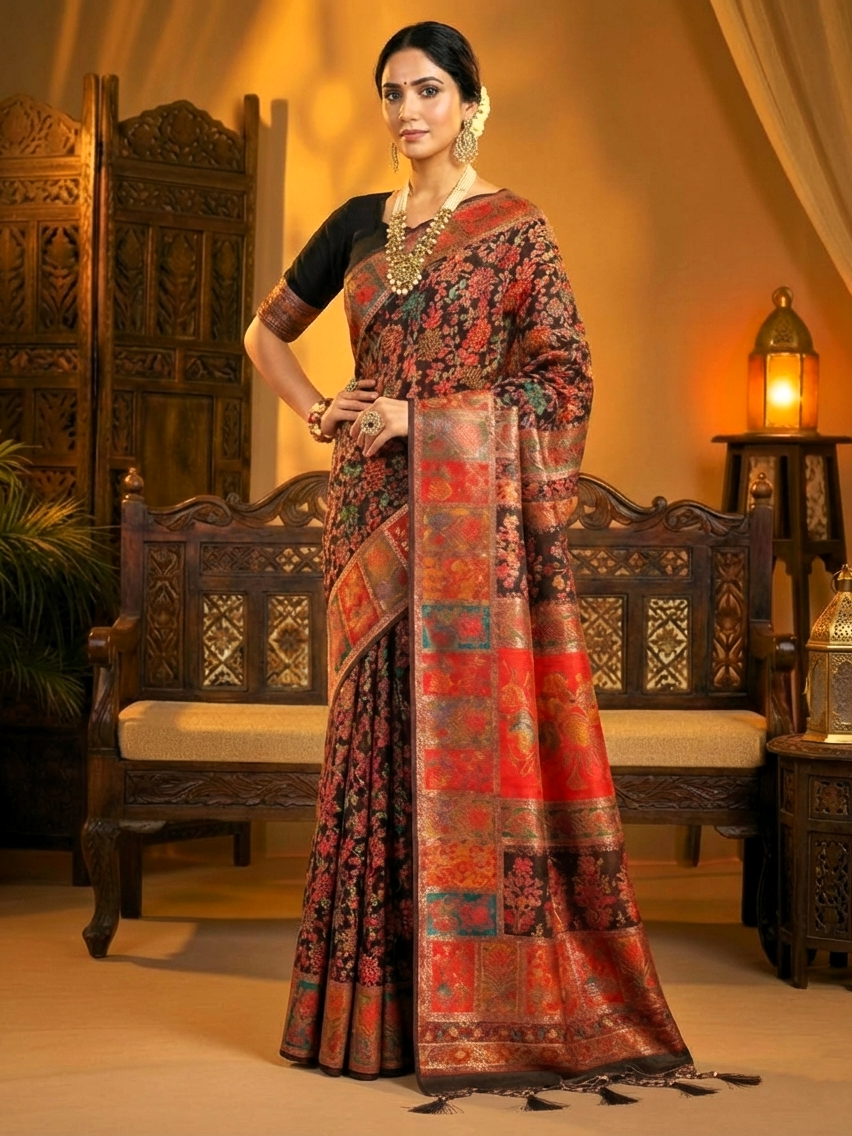Black Multicolor Woven Kashmiri Jamawar Saree – A Timeless Elegance